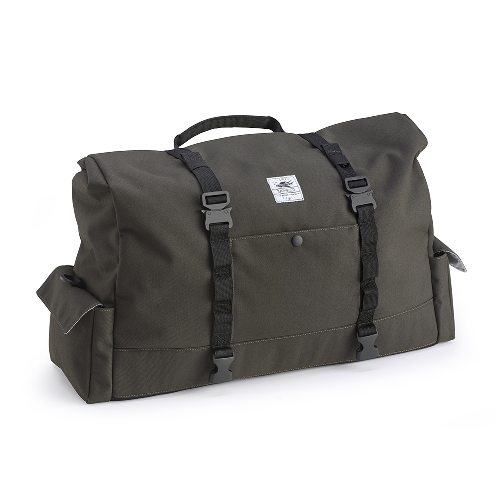 Oben im Bild: Satteltasche ECO, 26 Liter aus Nylon 470D, Recycling Materialien (Polybag), Flammenhemmendes Gewebe am Taschenboden, ungefärbten 190T Nylon und weiteren ressourcenschonenden Features.