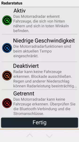 Bei Kopplung mit Tread 2 und Zumo 2 werden Shortcuts für die Radaranzeige angezeigt, sodass man schnell zur Radaransicht wechseln kann. Gelegentlich wurde auch der Gegenverkehr gescannt, wenn er langsam genug fährt, dann kann es zu ‚Phantombilder‘ kommen. Grundsätzlich ist noch zu beachten, dass auch Fahrzeuge, die man überholt in den Radarbereich einfahren können. Kurz gesagt: Für Technik Freaks und Leuten, die viel Autobahn fahren, eine lohnende Anschaffung. Nice to have besonders in der Kombination mit Tread oder Zumo XT 2 wegen visueller Anzeige.