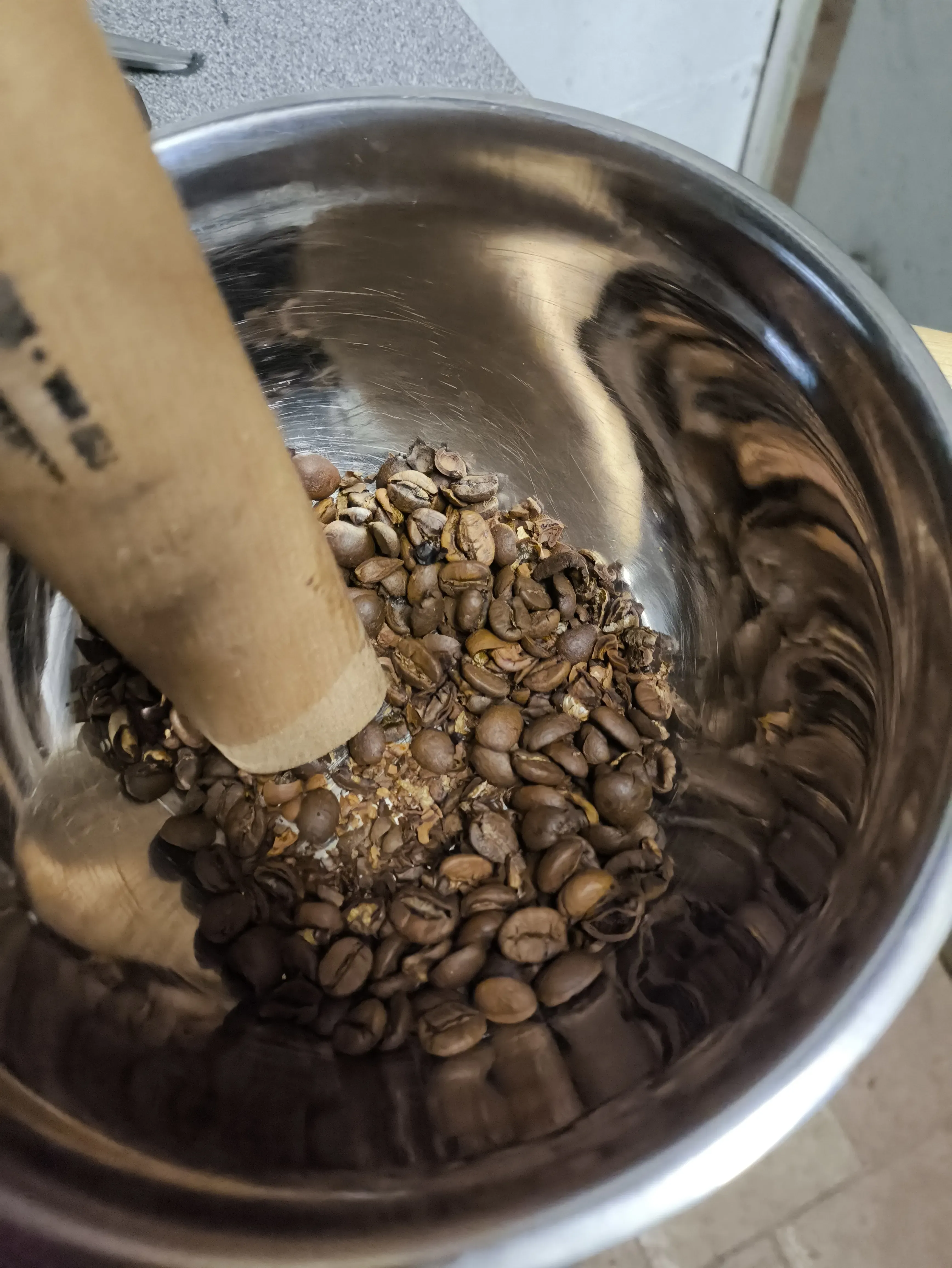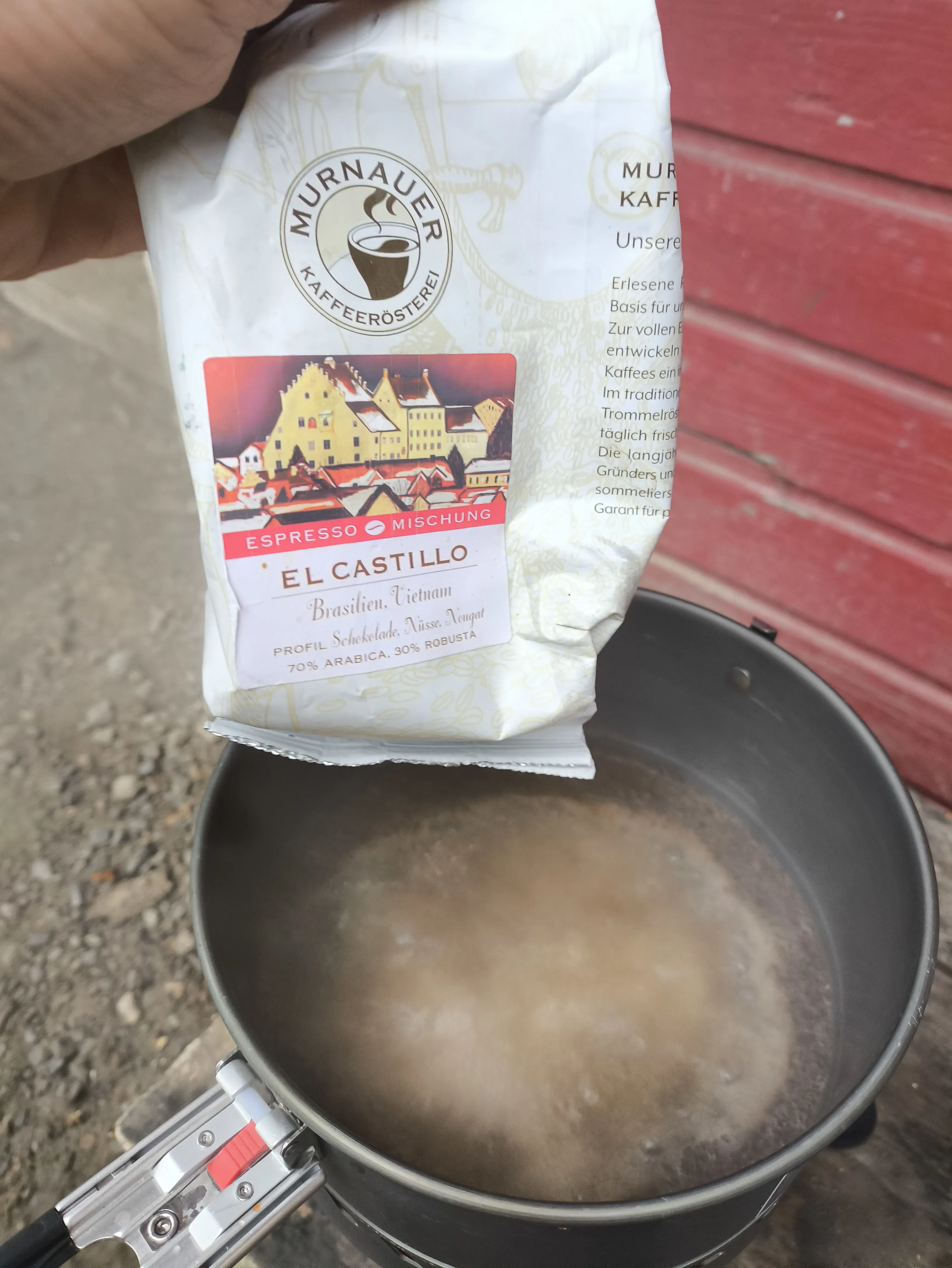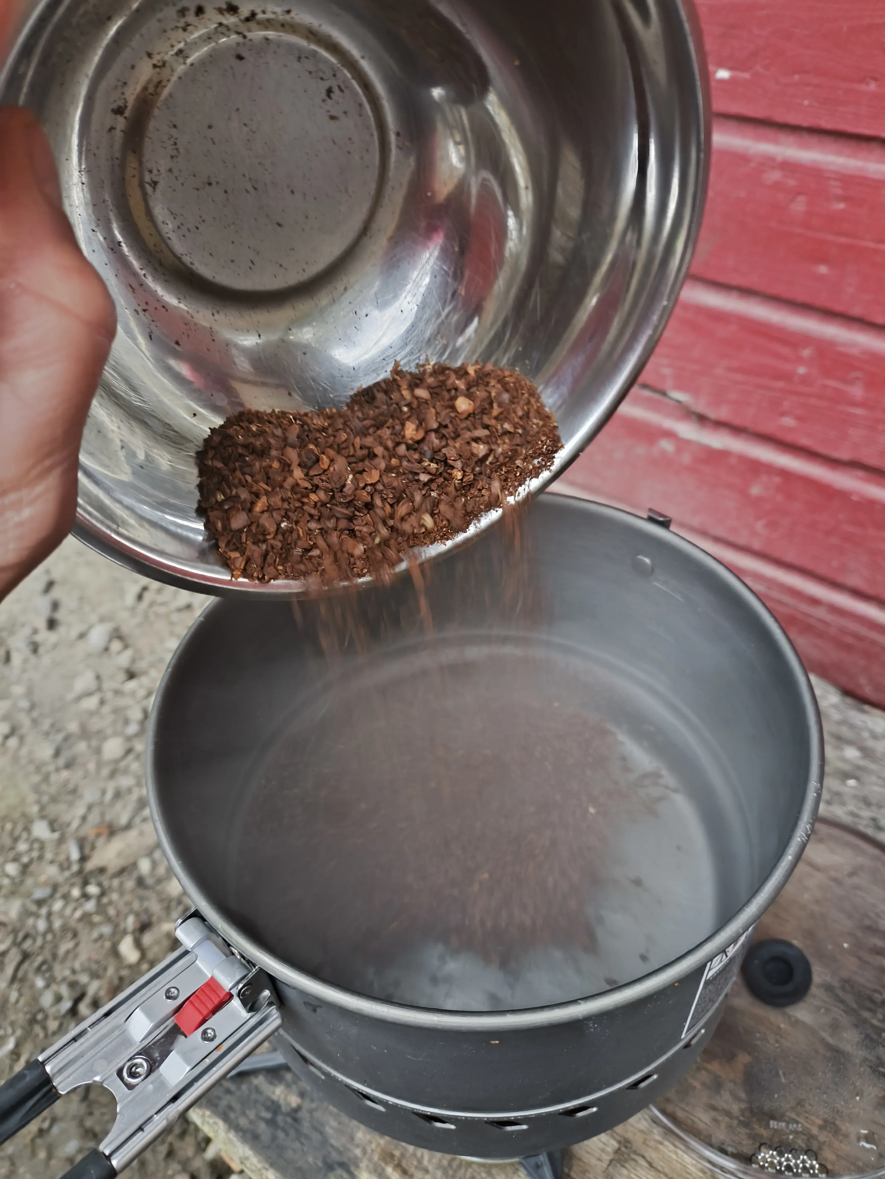 - Kaffee einrühren: Nimm den Topf vom Feuer und gib ca. 4–5 gehäufte Esslöffel grob gemahlenen Kaffee ins heiße Wasser. Gut umrühren.