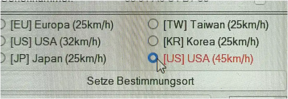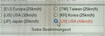[US] USA (45 km/h)– und „Setze Bestimmungsort" klicken. - Erst danach unten rechts die gewünschte maximale Geschwindigkeit (z. B.