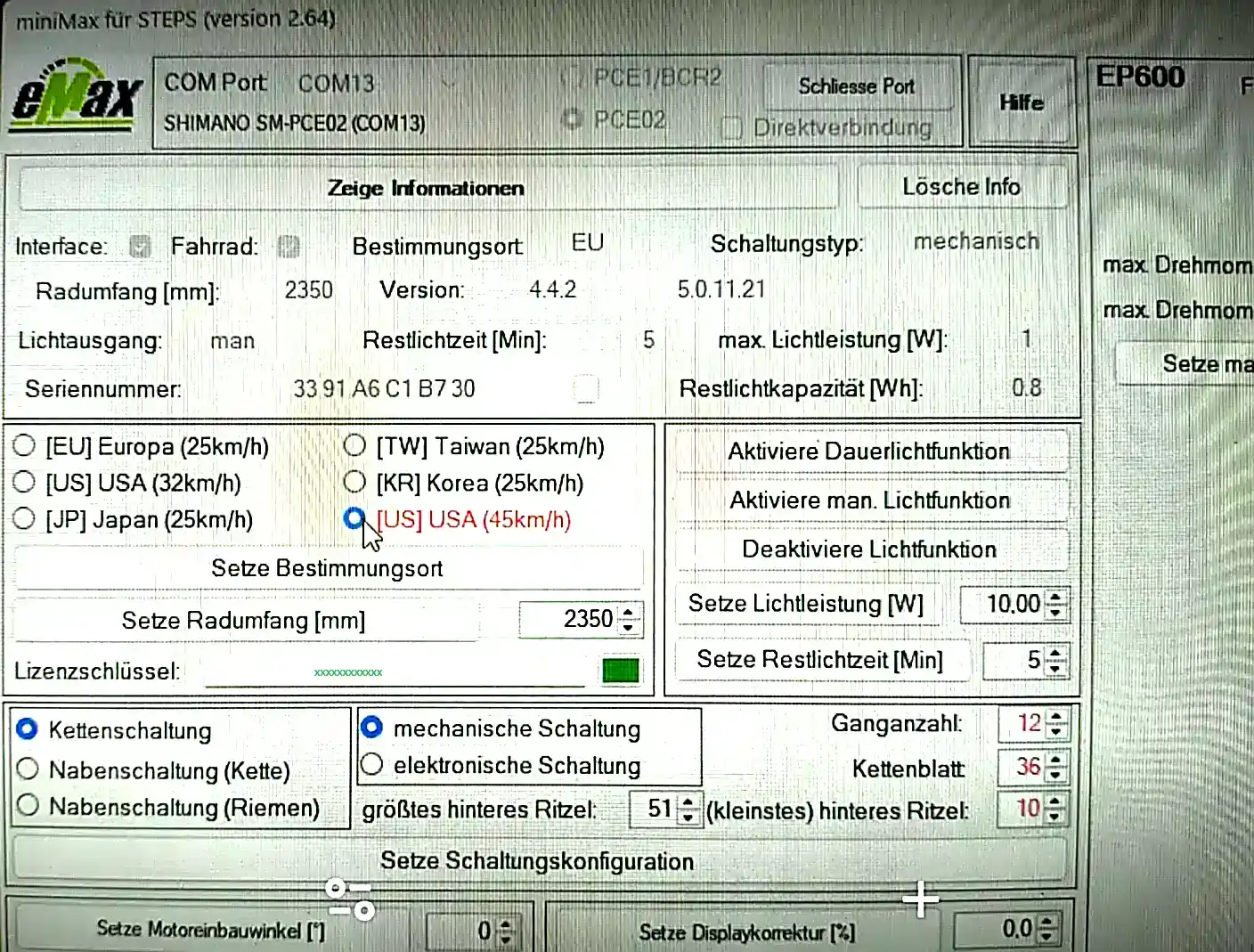 Für die Lizenzbestellung benötigt man die elektronische Seriennummer des Motors. Diese steht nicht auf dem Motorgehäuse und kann auch mit der Standard-Software von Shimano nicht ausgelesen werden. Sie lässt sich ausschließlich über miniMax (oder die eMaxMobileApp) per Software auslesen.