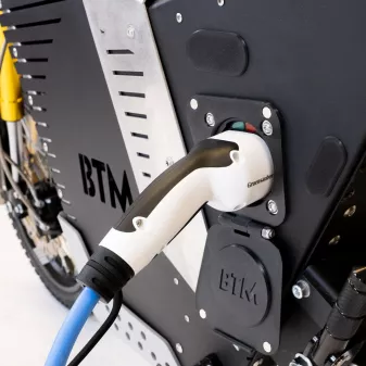 Auch die Bonfire, die wir schon getestet haben, profitiert vom neuen Akku ab März 2026 — hier sind es sogar 25 % mehr Reichweite und 10 % mehr Spitzenleistung. Ferner baut Viktor Sommer noch zwei modulare Optionen ein: Einen „Charge Tank“ (Onboard-Ladelösung, heute 2 kW, später erweiterbar auf 4 kW) und einen „Storage Tank“ — ein verstecktes 10-Liter-Staufach fürs tägliche Fahren. Schuko-laden zu Hause in der Garage geht weiterhin. Der (schwere) Akku kann auch herausgehoben werden.