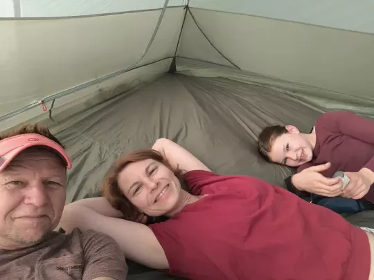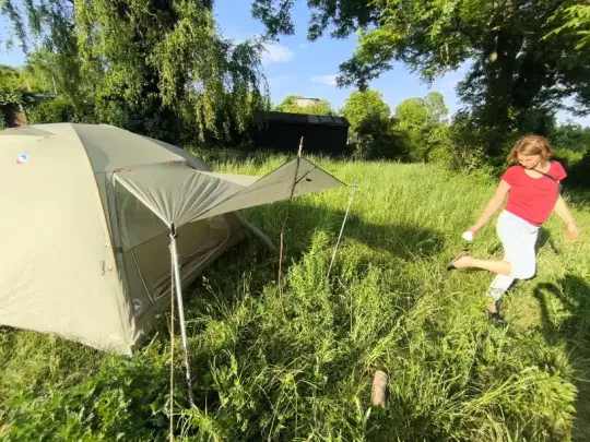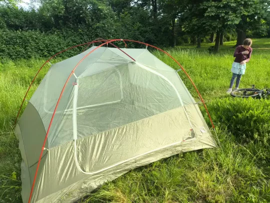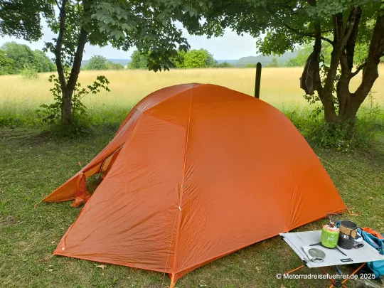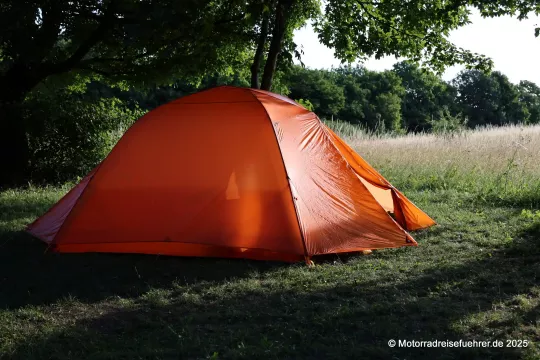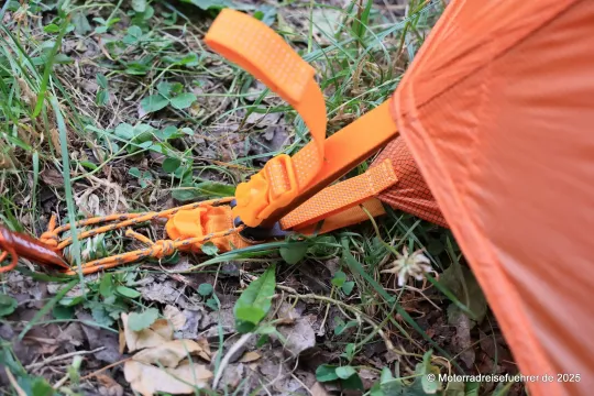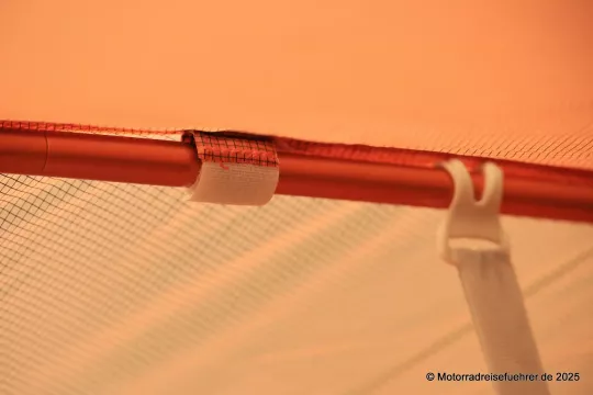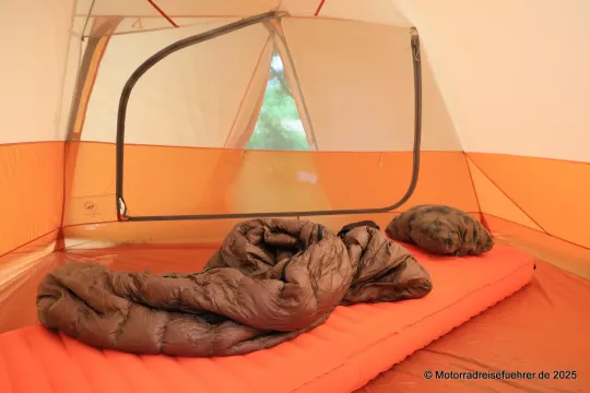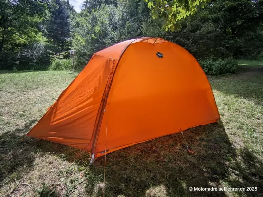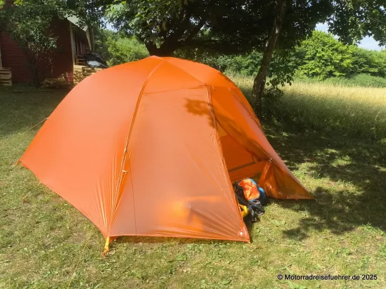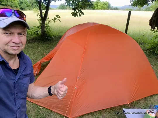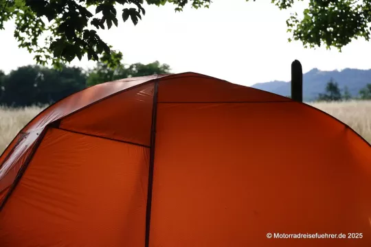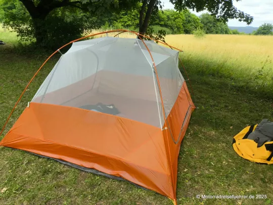 Erste Ergebnisse aus der Praxis: leicht aufzubauen, gute Idee mit dem 2. RV an den Apsiden für ein Vorzelt-Dach; Lüftungsmöglichkeiten gibt es nur eine im Dach, daher sollte man auch die Eingänge bei großer Feuchte leicht öffnen.