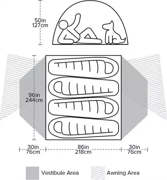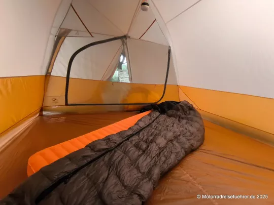 Innenmaße (L x B x H): 218 x 244 x 127 cm (zwei Doppel-Isomatten passen i. d. R. nicht hinein!), mehr Platz als im MSR Elixir 4!