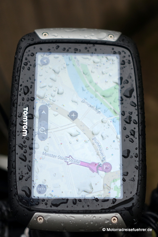 Der Bedienbarkeitstest des kapazitiven TomTom Displays bei Regen verlief positiv. Das kapazitive TomTom Display ist tatsächlich bei Regen und mit Handschuhen zu bedienen. Das spiegelte sich schon beim Pionier Garmin Monterra wieder. Das war nicht unbedingt zu erwarten, weil Regentropfen auch zu Irritationen führen können. Gewöhnungsbedürftig ist die Anordnung der Tastatur im Hochformat oder die Größe der Bedienfelder überhaupt. Mit dicken Handschuhen stößt man damit schnell an die Grenzen eines 4,3 Zoll Displays. Die Bedienung im Stillstand sollte man wirklich vorziehen. Der TomTom Rider 400 hat das hellste Display im Test, gefolgt vom Mamba und Zumo. Das kapazitive Smartphone Display des Riders scheint sich also bezahlt zu machen.