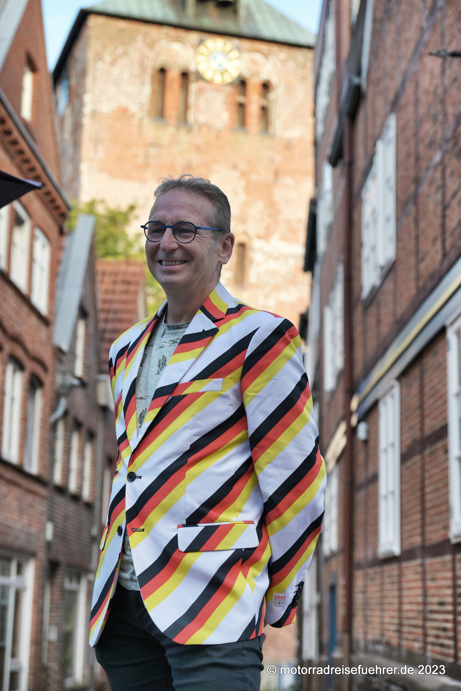 Stadtrundgang: Beginnend am Carl-Diercke-Haus, dem Geburtsort des gleichnamigen Schultalas starten wir die Führung, die oft den markanten Schwinge-Fluss kreuzt. Hansehafen, die mittelalterliche Kogge, die dort ‚eingesperrt‘ ist, bringen ein wenig Atmo von Amsterdam und Brügge. Tatsächlich ist aber alles nicht so hermetisch verkehrsberuhigt, wie es zuerst erscheint. Eine Gruppe Harley-Fahrern gelingt es, bis zur Nachbildung des Holztretkahns zu einem Café vorzustoßen. Insgesamt ein lebendiges Städtchen, in das man sich auch einmal bei einer Motorradtour hinein wagen sollte.