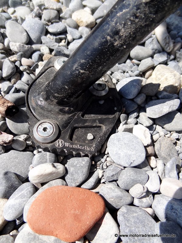 Das GS-Zubehör hat noch nicht viele Kilometer auf dem Buckel, aber viel Regen. Auch wenn es gerade in Ligurien wärmer ist als in Deutschland, kann man jedenfalls noch nicht von 'Hitze, Wärme oder Sommer' sprechen. Gut macht sich bisher bei Feuchtigkeit der zivile Pirelli Skorpion Trial. Auch ein paar Meter Schotter am Strand machen ihm nicht viel aus. Wie er sich auf Sardinen und verschleißmäßig macht, darauf müssen wir noch warten. Auch die Wunderlich Ständerplatte: Kleines Ding mit großer Wirkung: ist gut gemacht, sieht gut aus und sinkt nicht ein.