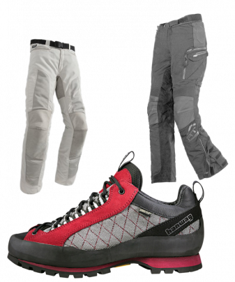 Die Louis Okovango-Endurohose ist beinahe ein Allwetter-Beinkleid mit vielen Variationsmöglichkeiten. Nur zu einer kurzen Hose kann man sie nicht umbauen, sonst ist alles möglich. Mit Gürtelschlaufen und etwas länger wäre sie perfekt. Was sie sonst noch zu bieten hat: Lederbesätze an Knie und Hüfte, zweifach verstellbare Knieprotektoren, wasserfeste Außentaschen, einen guten Wadenabschluss und ein wenig Abenteuer-Feeling.